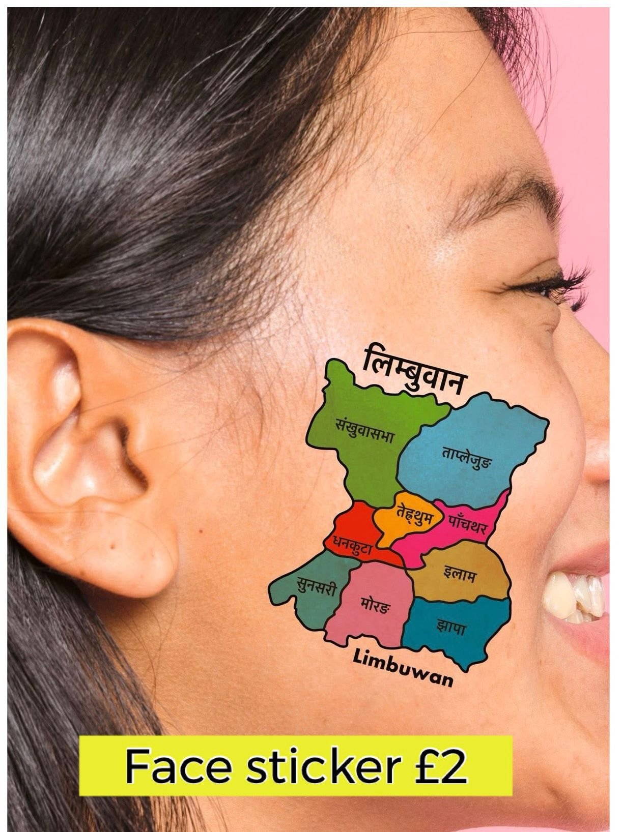 Express pride in your identity with this premium-quality face sticker featuring a vibrant and detailed map of the Limbuwan region. The design highlights key districts such as Taplejung, Ilam, and Panchthar. Made from skin-safe material, it is ideal for cultural festivals, rallies, and community events.